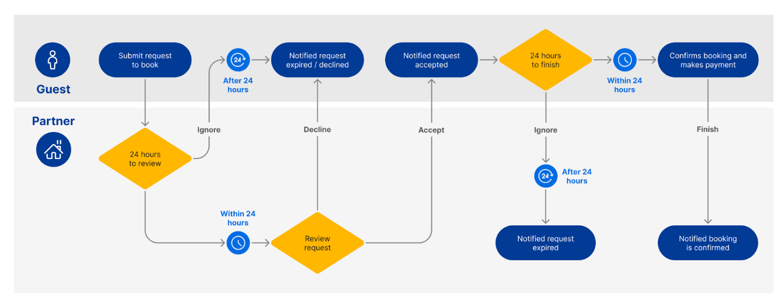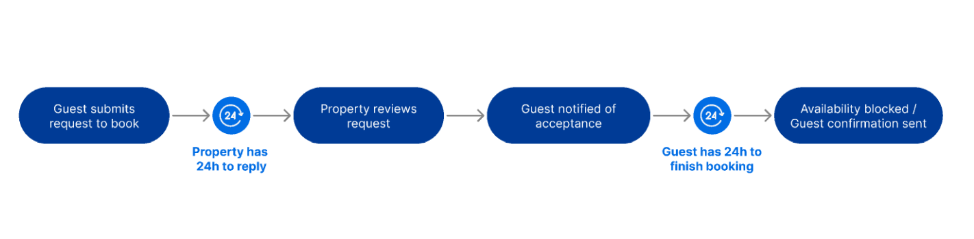 Request to Book is a reservation workflow where a guest sends a booking inquiry to a home accommodation, allowing the property to review the request details before either accepting or declining the request. This added level of control gives accommodation partners extra assurance and trust when welcoming guests into their homes.